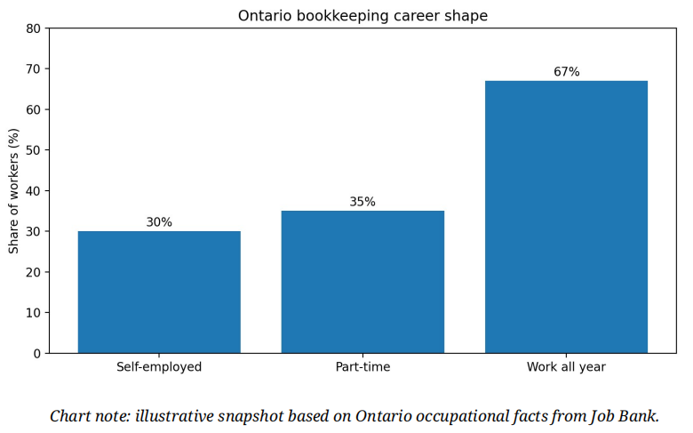 For many learners, the attraction is not only hourly pay. It is also flexibility. Ontario Job Bank notes that self-employment is relatively common in this occupation, which supports the idea that bookkeeping can become a service-based work-from-home or hybrid path for the right person over time.